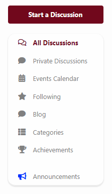 On the left side of the screen you should see a navigation menu that allows the user to switch to a different feature on the forum. For now, lets say hi to the forum members by “Starting a Discussion”! Above the navigation menu we just mentioned, press the “Start a Discussion” button.