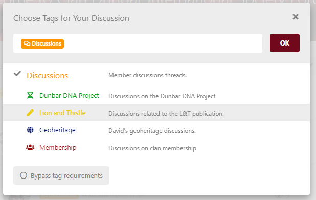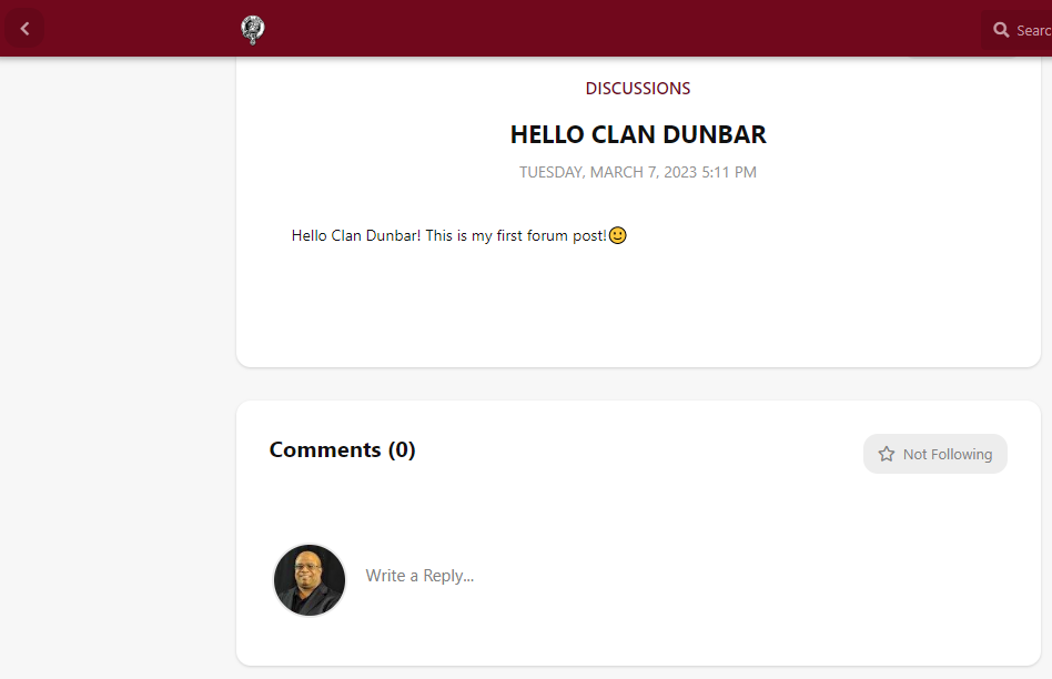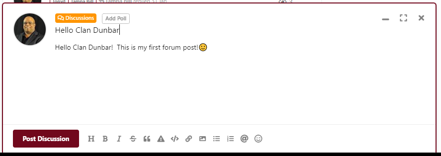 After pressing the “Start a Discussion” button, you are presented with a dialog where you can write a simple post to present an idea for discussion. Let’s title our discussion by typing over the “Discussion Title” text in the edit box. Let title it, “Hello Clan Dunbar”! Just above the title edit box is a button labeled “Choose Tags”. Press this button and lets choose a tag that will automatically categorize this discussion for simple reference in the future. Select the “Discussions” tag and press the '“OK” button. Next, type a message in text area of the discussion dialog. Optionally, insert an emoji make your new post a little more interesting. Now press the “Post Discussion” button at the bottom of the dialog box.